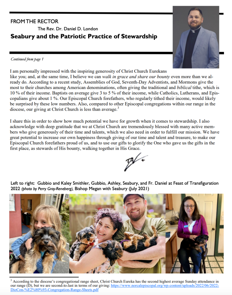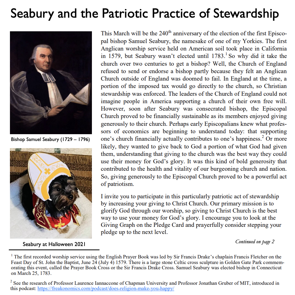 This March will be the 240th anniversary of the election of the first Episcopal bishop Samuel Seabury, the namesake of one of my Yorkies. The first Anglican worship service held on American soil took place in California in 1579, but Seabury wasn’t elected until 1783.[1] So why did it take the church over two centuries to get a bishop? Well, the Church of England refused to send or endorse a bishop partly because they felt an Anglican Church outside of England was doomed to fail. In England at the time, a portion of the imposed tax would go directly to the church, so Christian stewardship was enforced. The leaders of the Church of England could not imagine people in America supporting a church of their own free will. However, soon after Seabury was consecrated bishop, the Episcopal Church proved to be financially sustainable as its members enjoyed giving generously to their church. Perhaps early Episcopalians knew what professors of economics are beginning to understand today: that supporting one’s church financially actually contributes to one’s happiness.[2] Or more likely, they wanted to give back to God a portion of what God had given them, understanding that giving to the church was the best way they could best use their money for God’s glory. It was this kind of bold generosity that contributed to the health and vitality of our burgeoning church and nation. So, giving generously to the Episcopal Church proved to be a powerful act of patriotism.