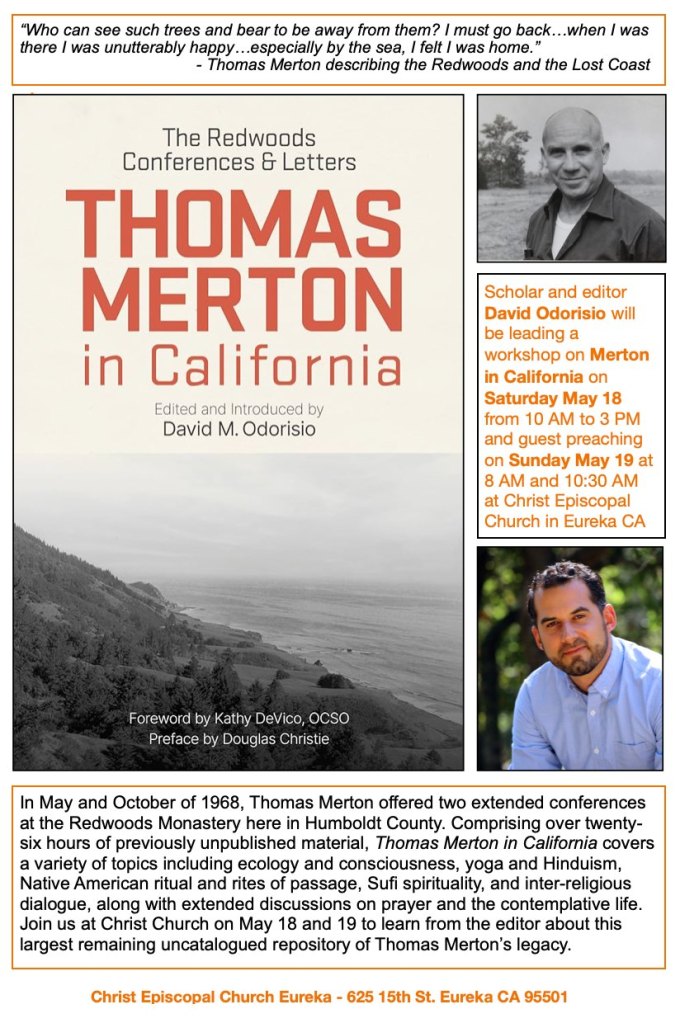 On Saturday May 18, David M. Odorisio, the editor of Thomas Merton in California, led a workshop on the Trappist monk Thomas Merton that included presentations, conversations, Centering Prayer, and lunch. We gathered at Christ Church Eureka (625 15th Street Eureka CA) at 10 AM, took an hour-long lunch break at 12 PM, and then resumed our conversations from 1 PM to 3 PM. David’s book Thomas Merton in California has put Eureka and Humboldt County on the map for tens of thousands of Thomas Merton fans and contemplatives around the world.