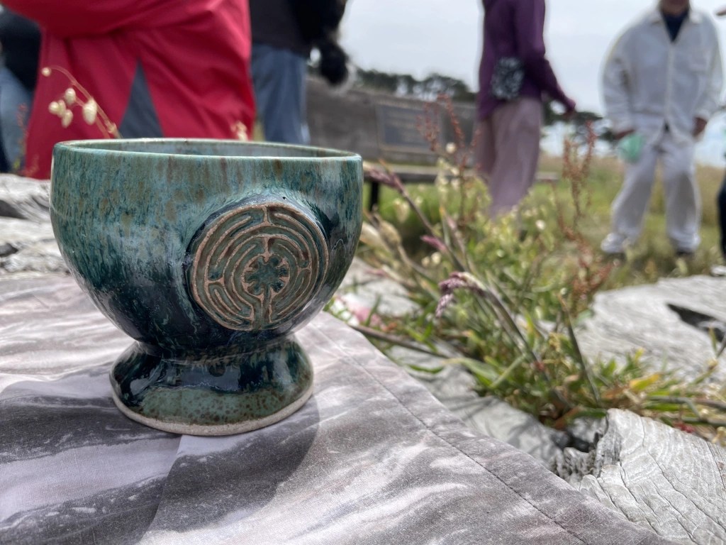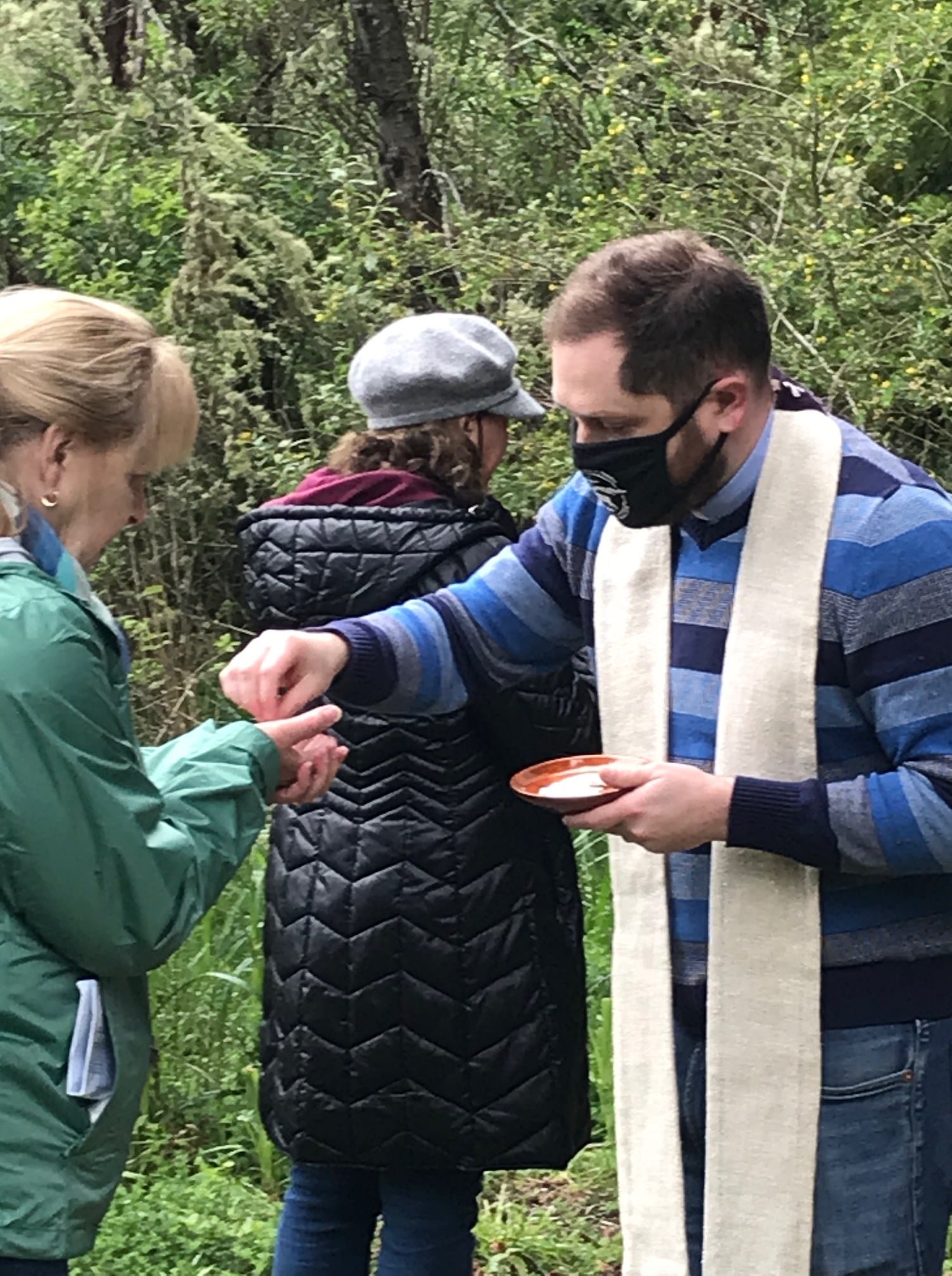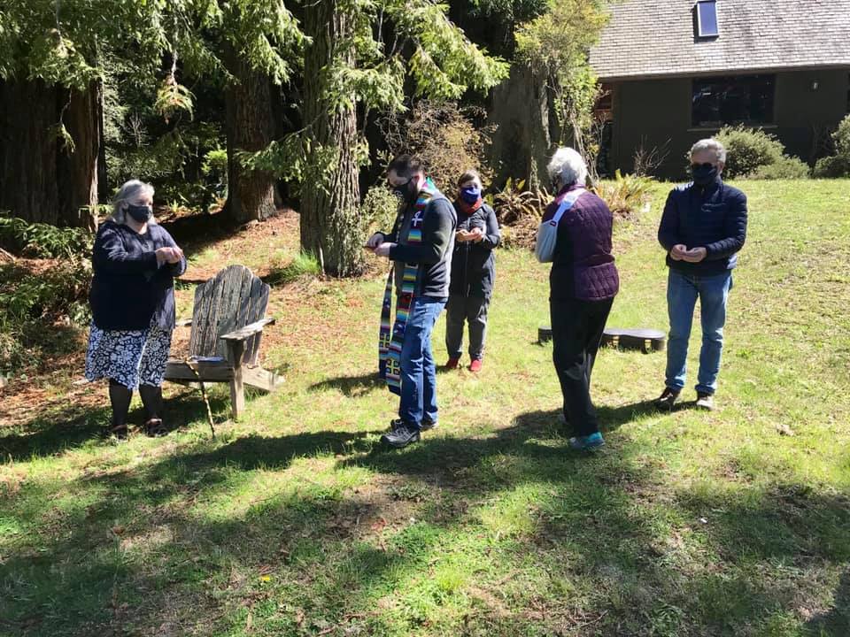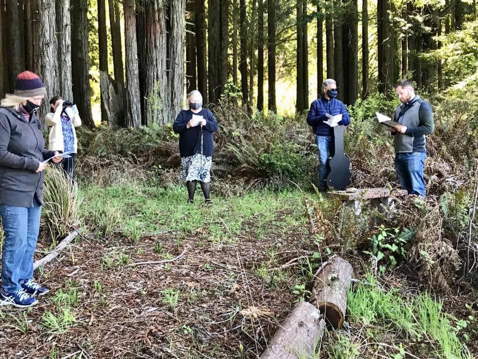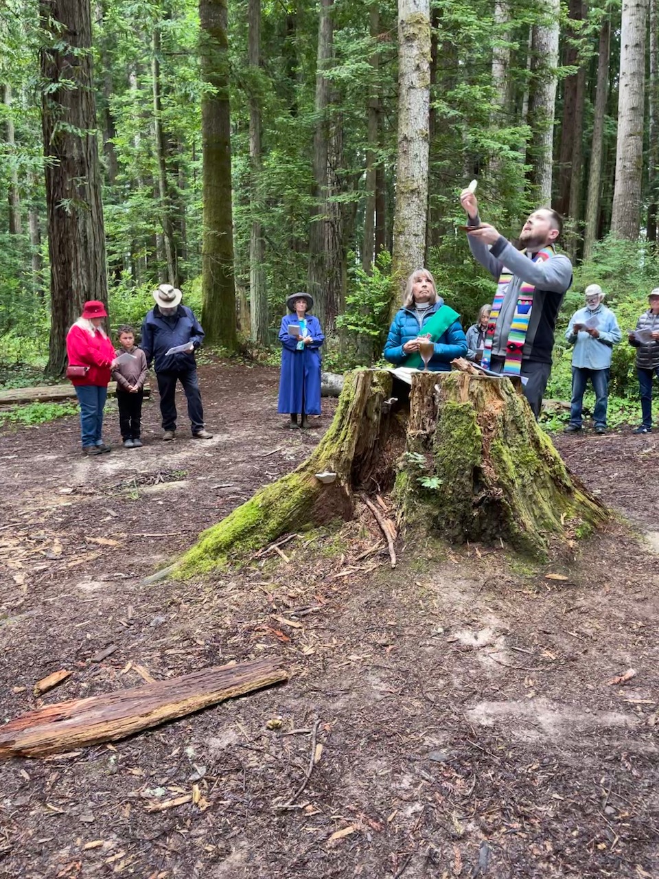 On select Saturdays, we celebrate an outdoor Eucharist at Sequoia Park in Eureka CA while sauntering through the redwood trees. We gather at the park entrance for opening prayer and then saunter to a beloved sequoia tree that we affectionately call “the gargoyle tree” because of its delightfully gnarled burls. We then pray a Psalm together by a trickling waterfall. From there, we proceed to a nearby bench for the reading of the Gospel and a brief devotional reflection. We then gather around a fountain by a duck pond for the Prayers of the People and the Passing of the Peace. Finally, we slowly ascend a small hill to arrive at a meadow, where we form a circle around a redwood tree trunk altar to sing and celebrate Eucharist.